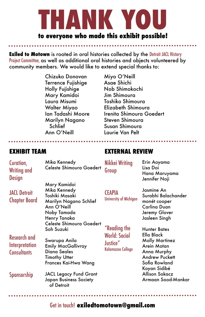 Exiled to Motown is not an exhibit that seeks to prove Japanese Americans exist–or even to prove we exist in the Rustbelt! Rather, through this exhibit we hope to explore how our community has persisted, at the level of memory, of moment. We hope to linger over small things, like picnic days and bowling leagues, to get at the big ones: Detroit’s role in brokering relationships between Japanese Americans and other Midwesterners, as well as Japan and the United States. The development of a pan-Asian solidarity. The solidarities we owe our black and brown neighbors, our immigrant neighbors, our asylum seekers, and our indigenous hosts.