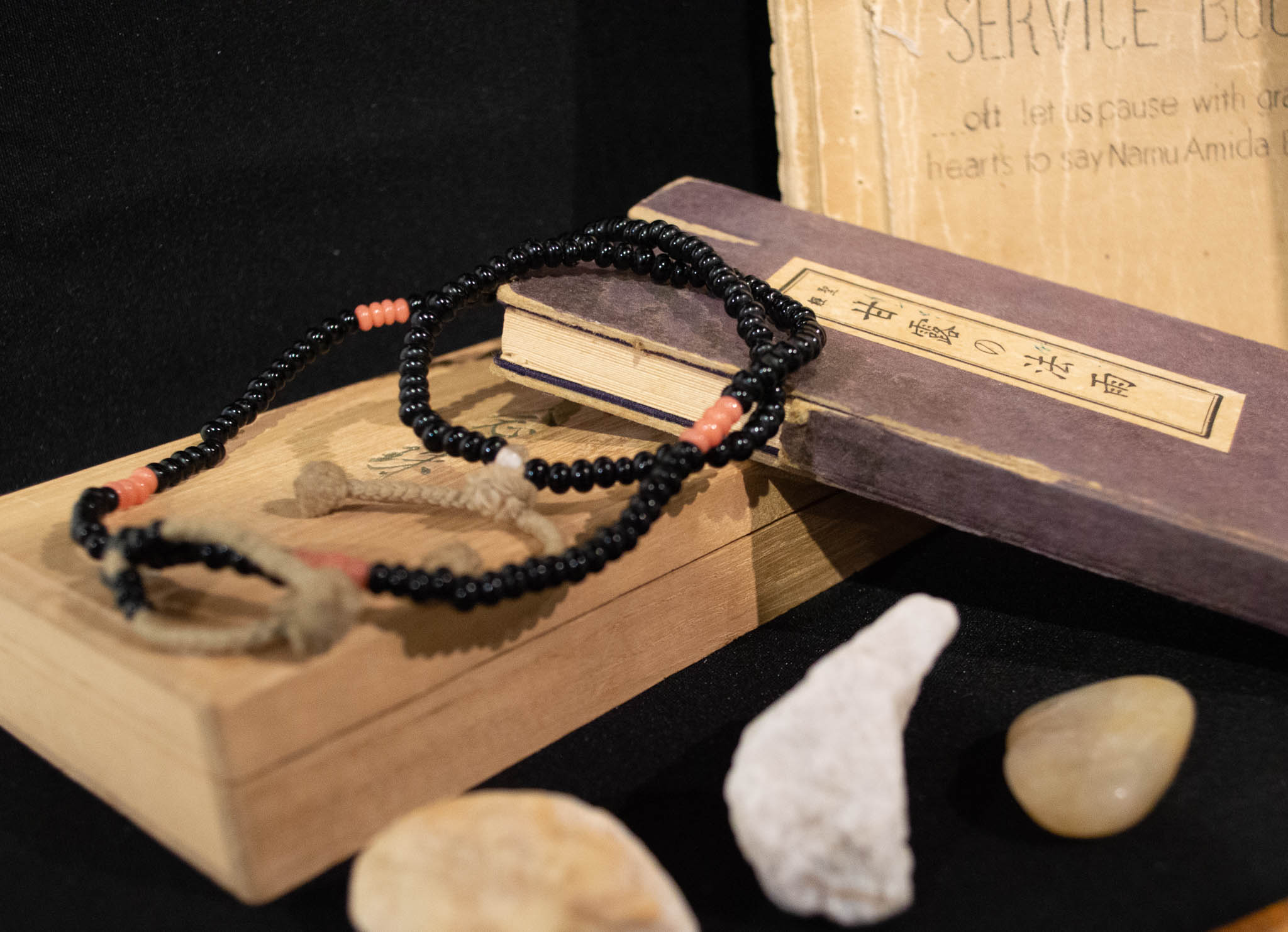 Antique ojuzu (Buddhist prayer beads) and sutra book, along with rocks from the Rohwer incarceration camp. Items lent by Mary Kamidoi.